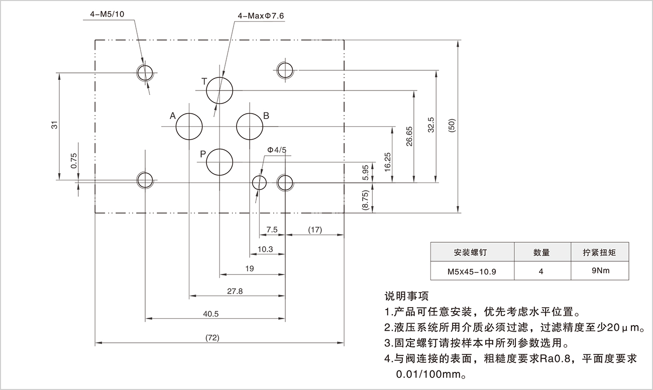油液最高允許污染度按NAS1638第9級(jí), 推薦過(guò)濾器過(guò)濾精度最小β10≥75。 |
