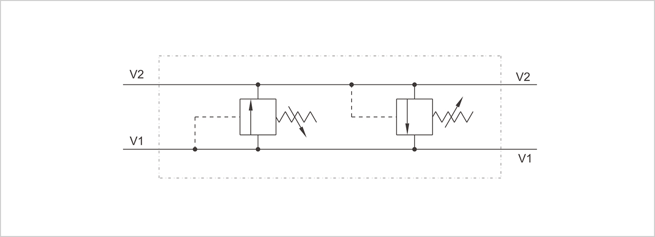 此雙向交叉溢流閥由兩個帶交叉油箱的溢流閥組成,此閥用于阻斷一個執(zhí)行元件或液壓馬達(dá)的兩個油口壓力至某個設(shè)定值。理論上它能提供突然的壓力抖動的保護(hù),也能調(diào)節(jié)一個液壓電路的兩個油口的不同壓力。