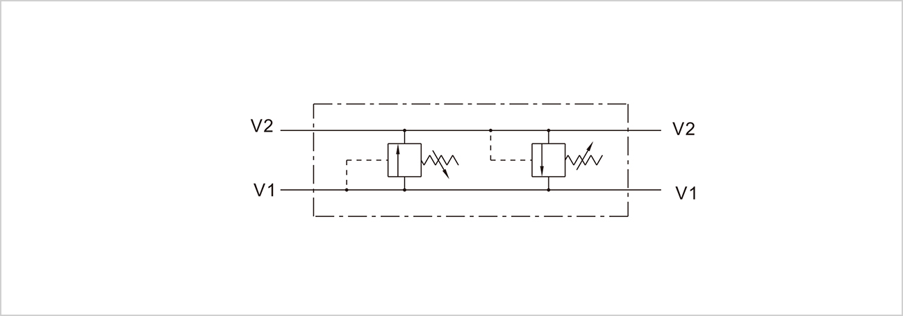 該雙向交叉溢流閥由兩個(gè)交叉的溢流閥組成,用于阻斷一個(gè)執(zhí)行元件或保證液壓馬達(dá)的兩個(gè)油口壓力至某個(gè)設(shè)定值。理論上它能對(duì)壓力脈動(dòng)提供保護(hù),也能調(diào)節(jié)液壓回路兩個(gè)回路的不同壓力。