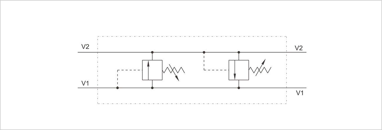 此壓差式雙向交叉溢流閥由兩個帶交叉油箱的溢流閥組成,此閥用于阻斷一個執(zhí)行元件或液壓馬達的兩個油口壓力至某個設(shè)定值。理論上它能提供突然的壓力抖動的保護,也能調(diào)節(jié)一個液壓電路的兩個油口的不同壓力。此壓差式雙向交叉溢流閥。雖然開啟卸壓功能較慢,但彈簧設(shè)定值在壓力流變化時較穩(wěn)定。