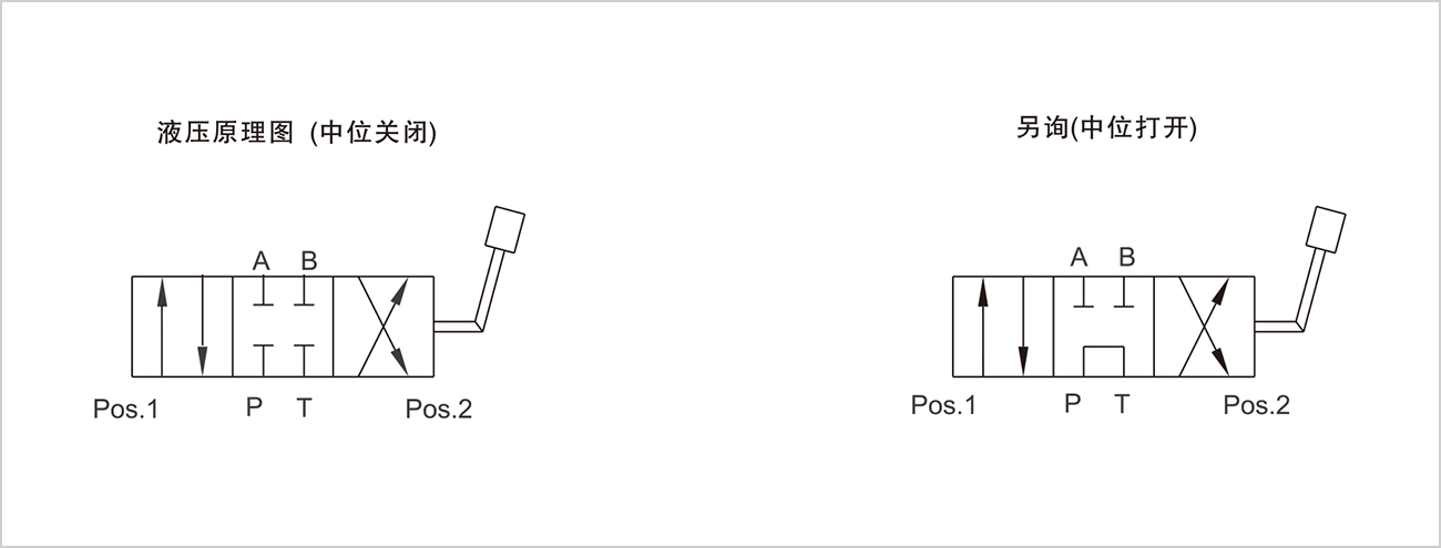P口接壓力油口,T口接油箱,A,B口接油缸或馬達(dá)。當(dāng)把手處于位置A時(shí),P通A, B口回油;當(dāng)把手處于位置B時(shí),P通B, A口回油;當(dāng)把手處于處于中位時(shí),油口全部斷開(kāi)(O型機(jī)能)