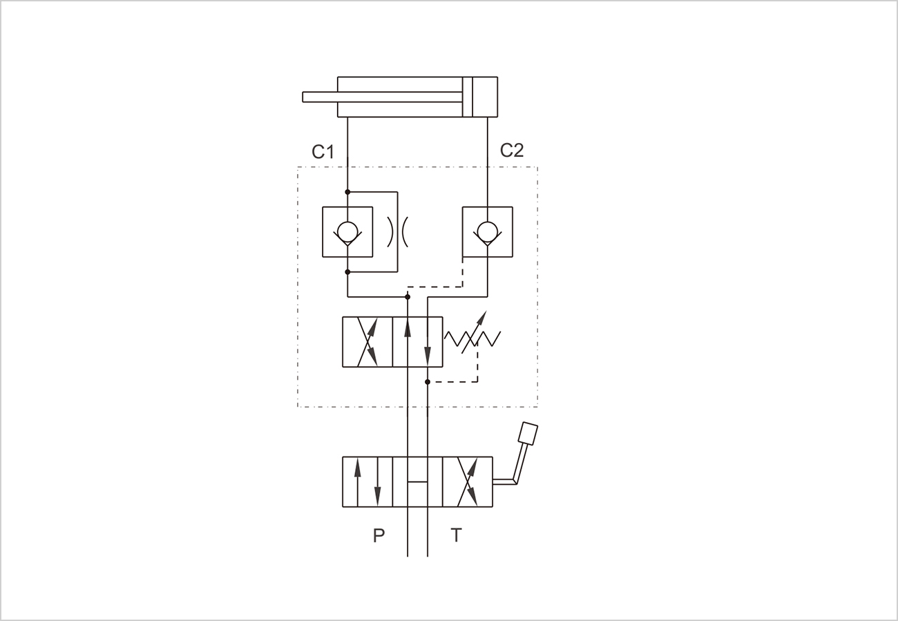 C1連接油缸的C2連接油路塊, P, T油口連接至機(jī)器的進(jìn)油口。體積小巧,可與液壓油缸成行安裝,或直通過(guò)閥體上的螺紋口直接安裝在雙向犁上。