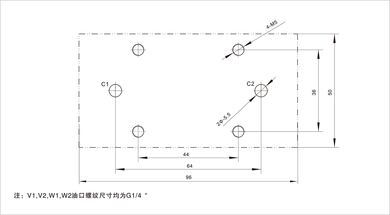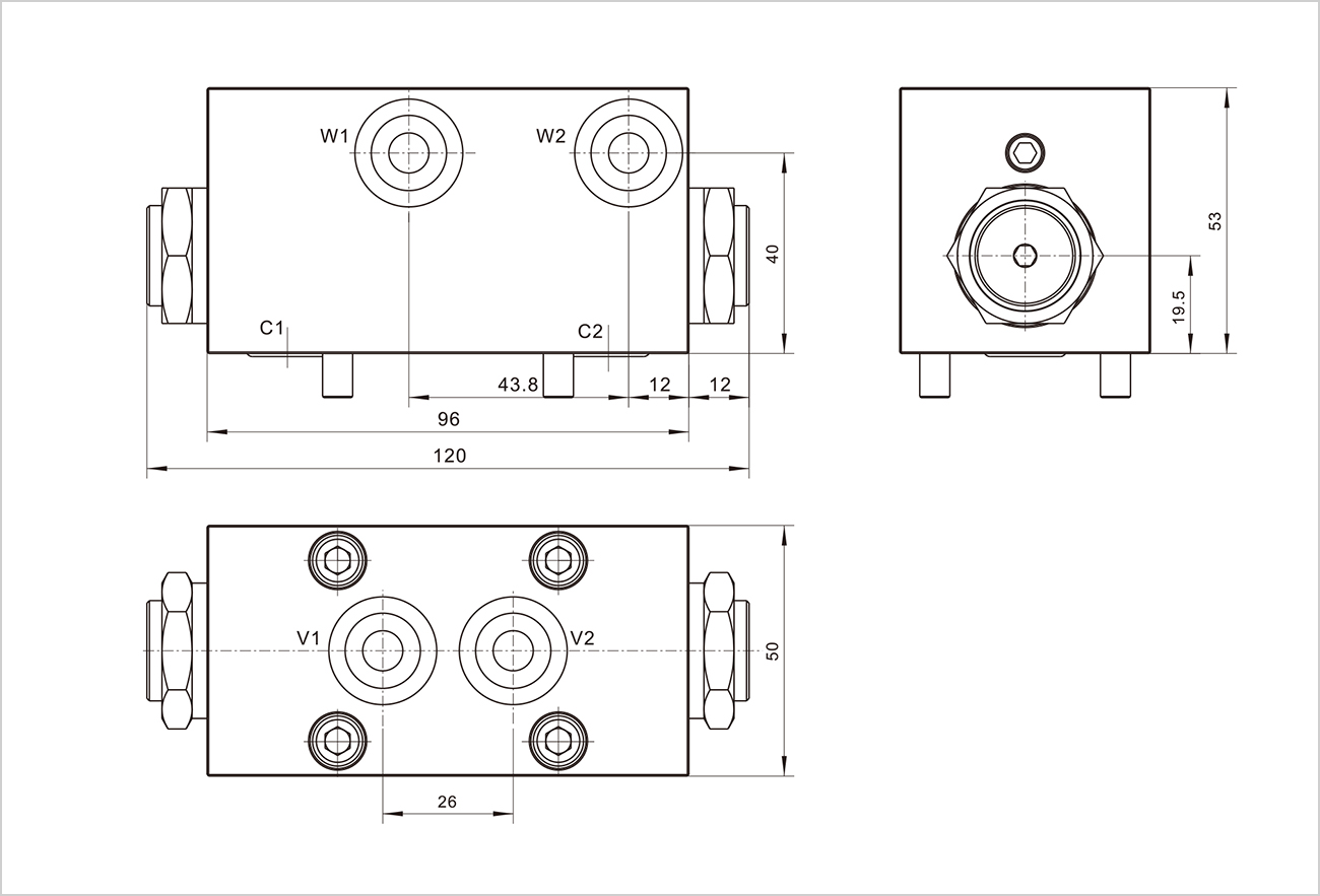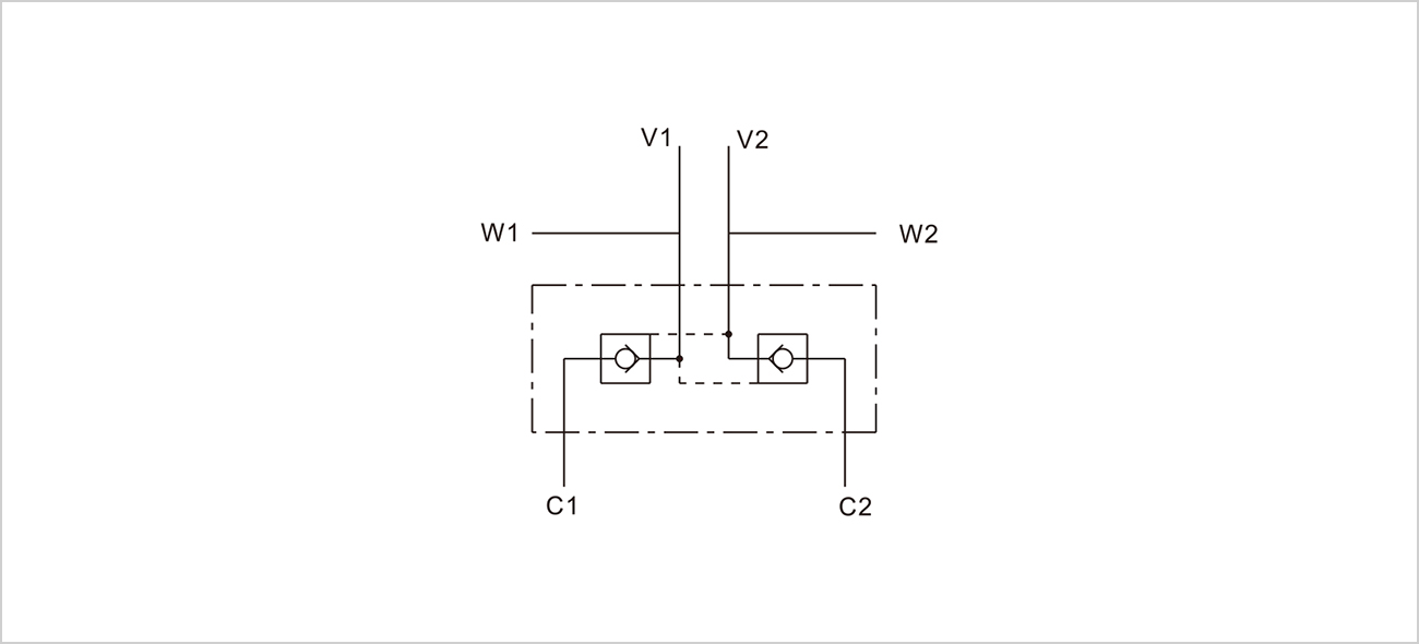 將V1,V2口接至壓力油路,C1,C2接到管路的執(zhí)行機(jī)構(gòu),W1,W2可接壓力表,也可用平面螺堵堵死,安裝方式可根據(jù)使用方法的不同而改變。