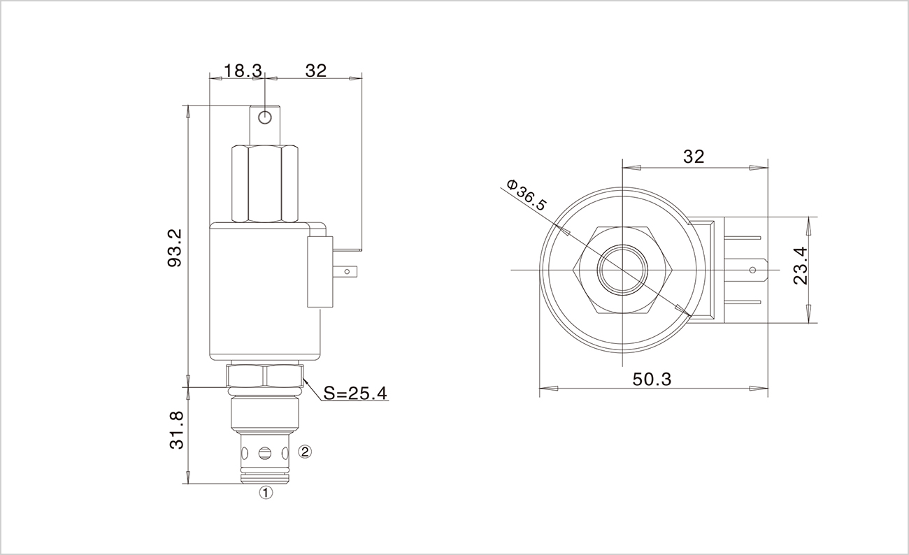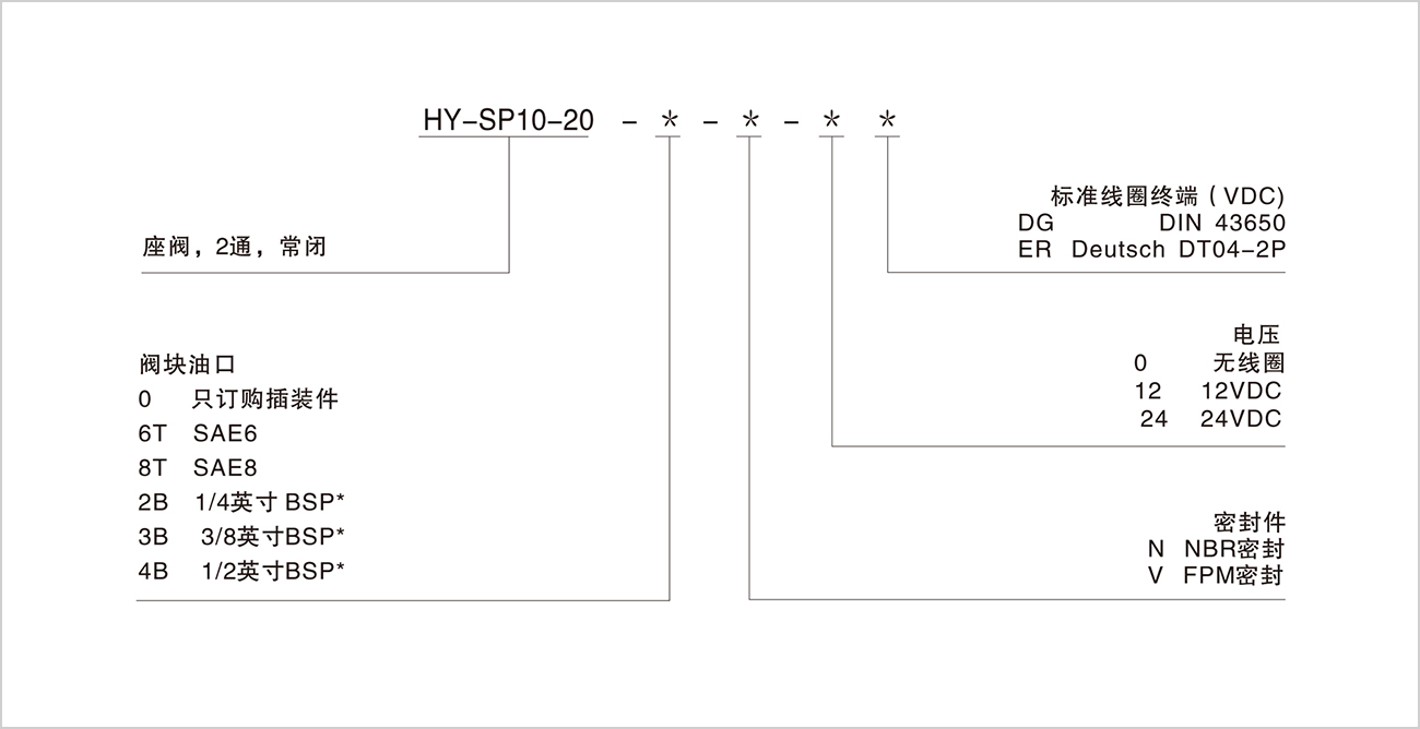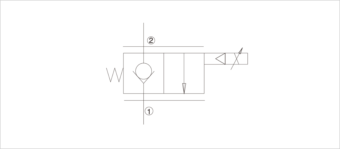 斷電時,HY-SP10-20用作單向閥,允許油液從①流向② ,同時截止油液從② 流向① 。通電時,②流向① 的通道將被打開。流量與作用到線圈中的電流成比例。應急手控也可以改變流量。