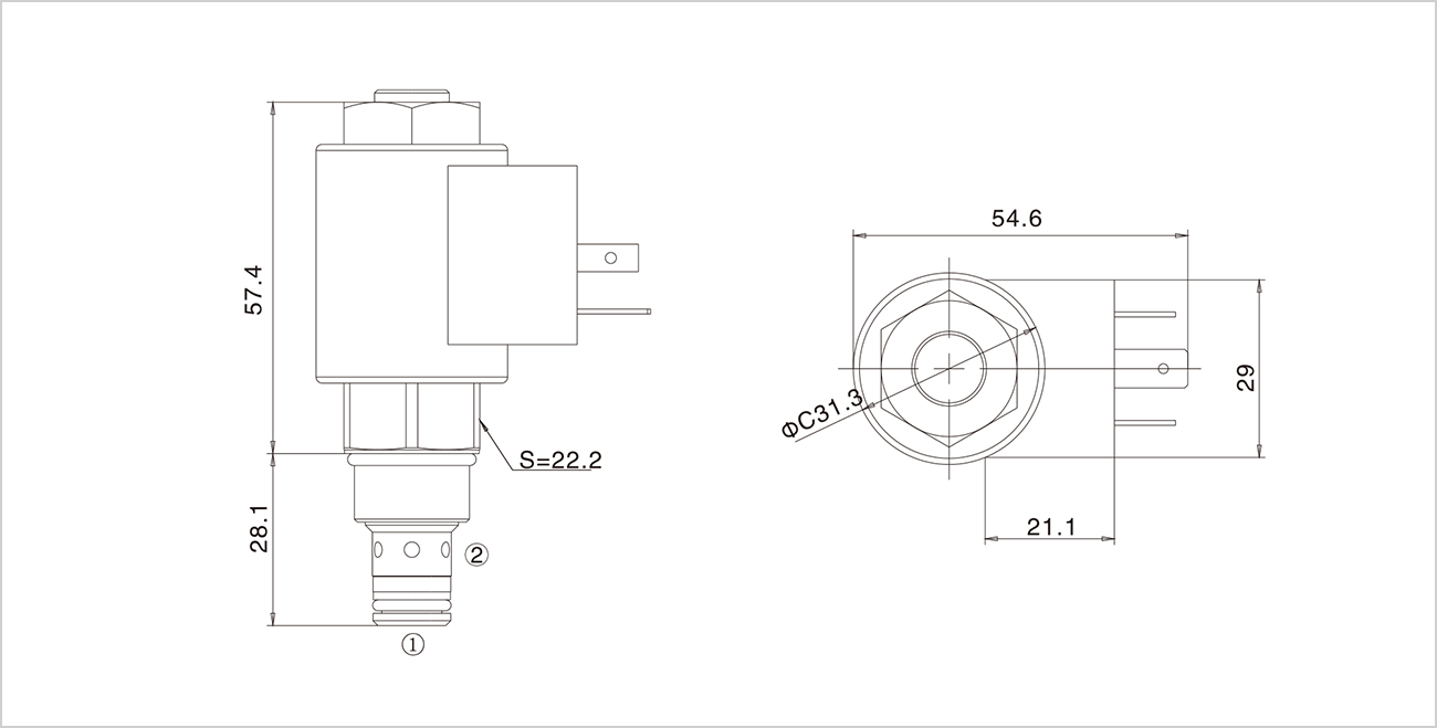 自由流通:①到②,線圈通電; 溢流:①流向②,線圈斷電 |