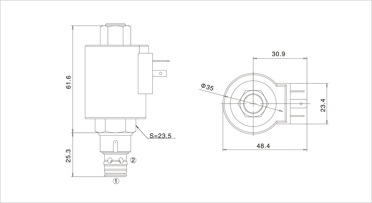 自由流通:①到②,線圈通電; 溢流:①流向②,線圈斷電 |