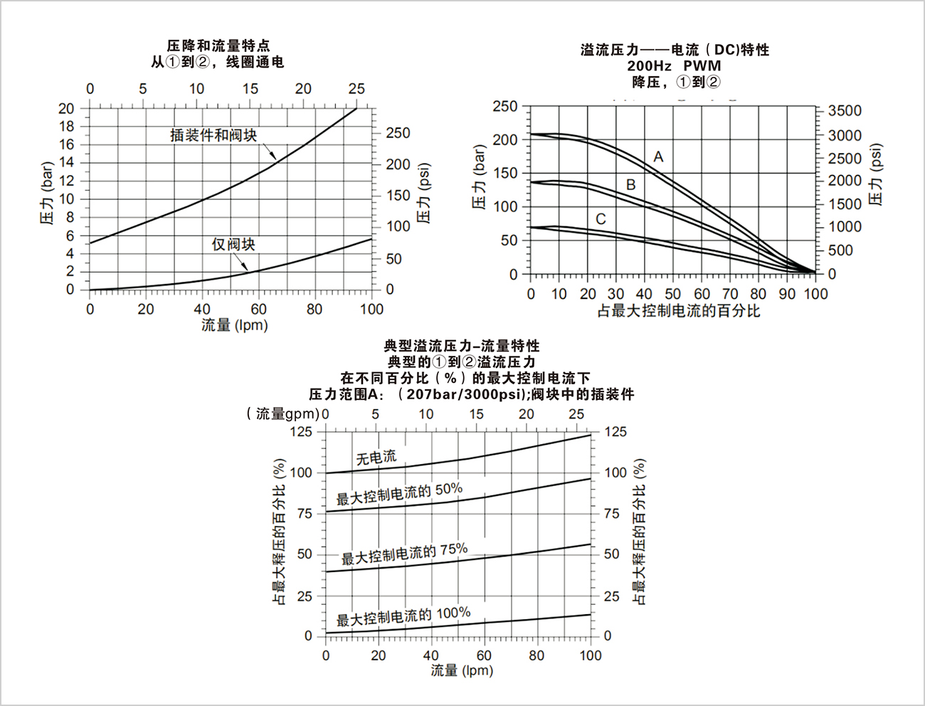 75.7lpm(20gpm),DP=14.8bar(215psi)僅指插裝閥,①流向②,線圈斷電 |