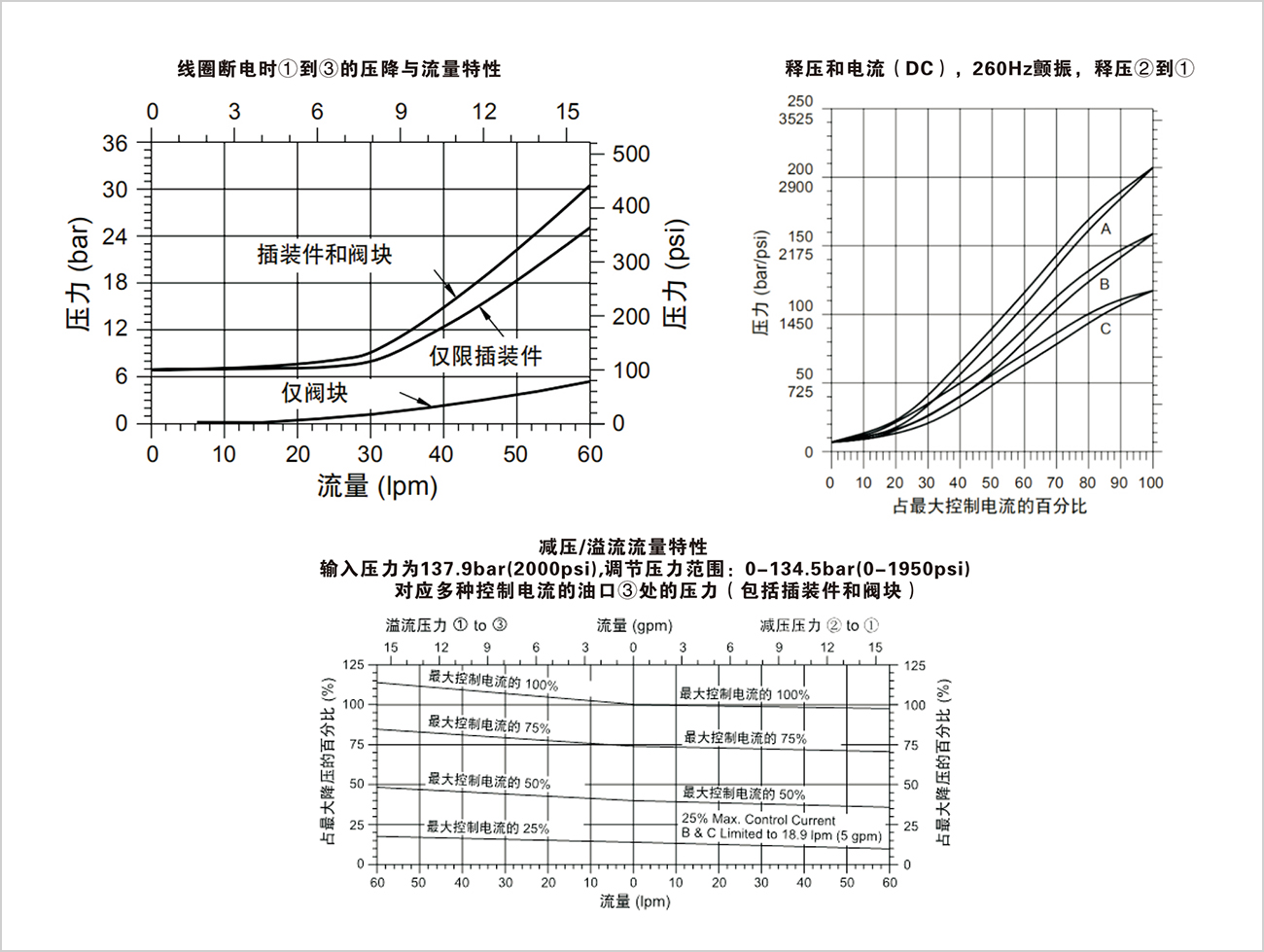 線圈斷電,插裝閥自身壓降為22.8bar(330psi)時(shí),①流向③的額定流量:56.8lpm(15gpm) |