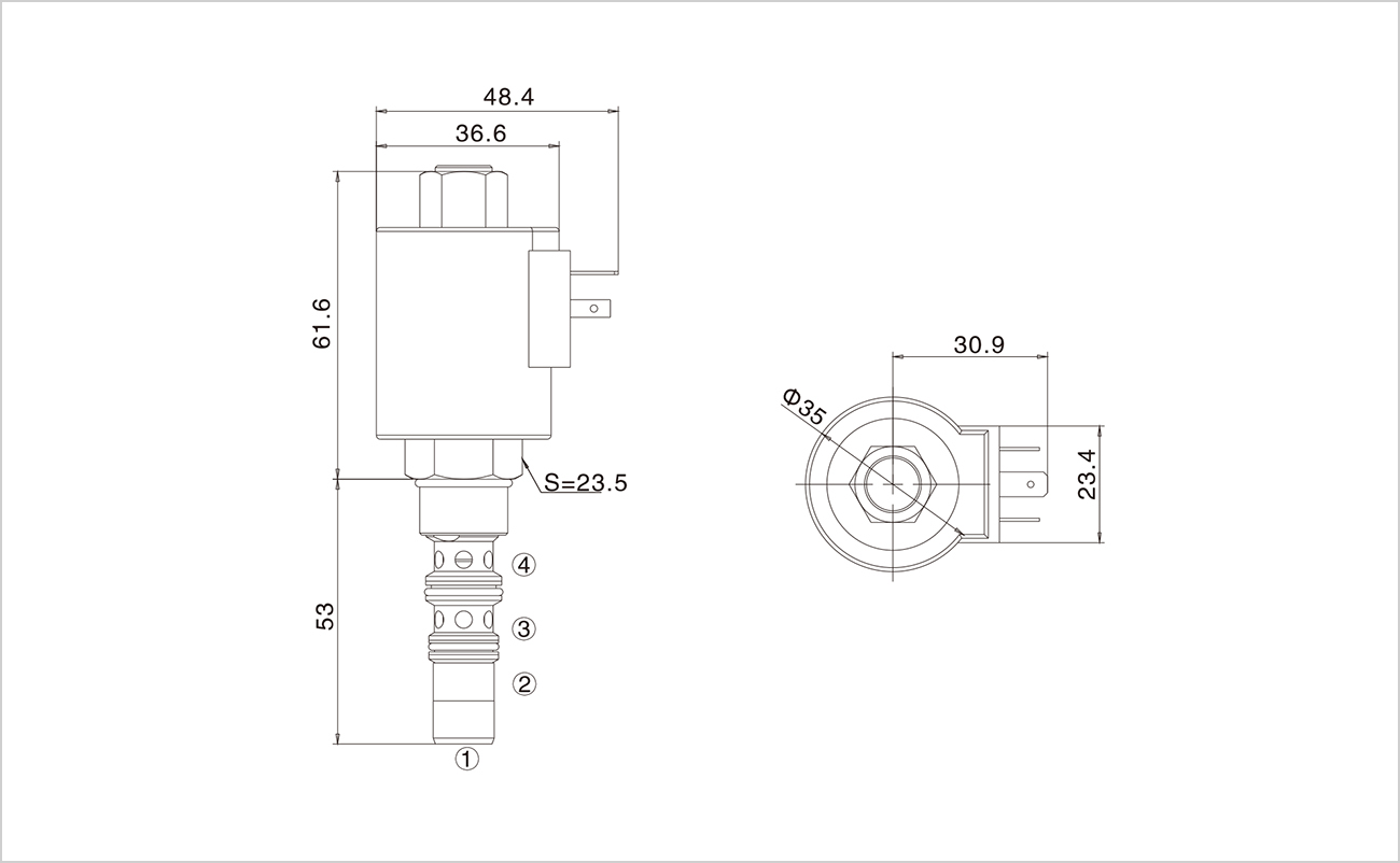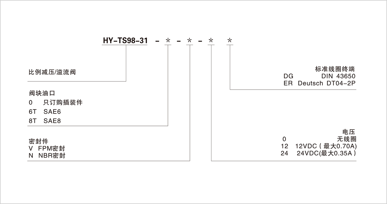 未通電時, HY-TS98-31允許油液從③到④雙向流動而封閉口②。線圈通電時,③將連至 ②,③處的受控壓力與線圈中的電流成比例。如果③處的壓力超過線圈產(chǎn)生的設(shè)定值,則③處向④處溢流。油口④的背壓將1:1加在壓力設(shè)定值上。