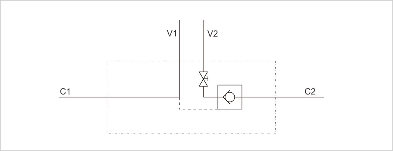 連接V1 和V2 到壓力流量,連接 C1 到執(zhí)行機(jī)構(gòu)的自由流側(cè),連接C2 到執(zhí)行機(jī)構(gòu)想要被阻斷的一側(cè)