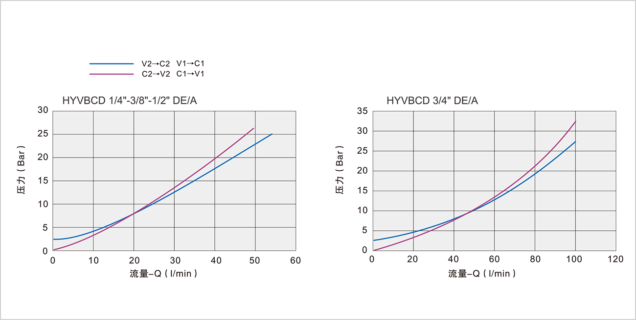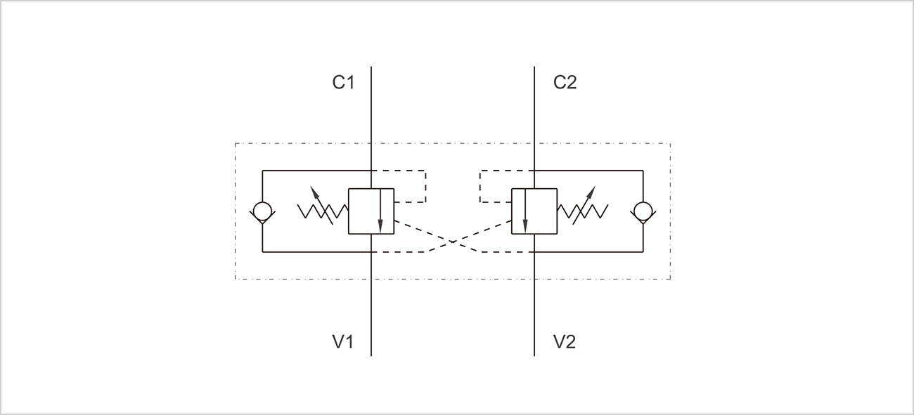 連接V1和V2到壓力流,連接C1和C2到執(zhí)行元件,由執(zhí)行元件直接控制。直通式安裝。