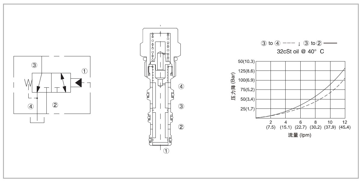 當(dāng)①口有先導(dǎo)壓力信號(hào)時(shí),閥芯換向,③到②通,④不通;