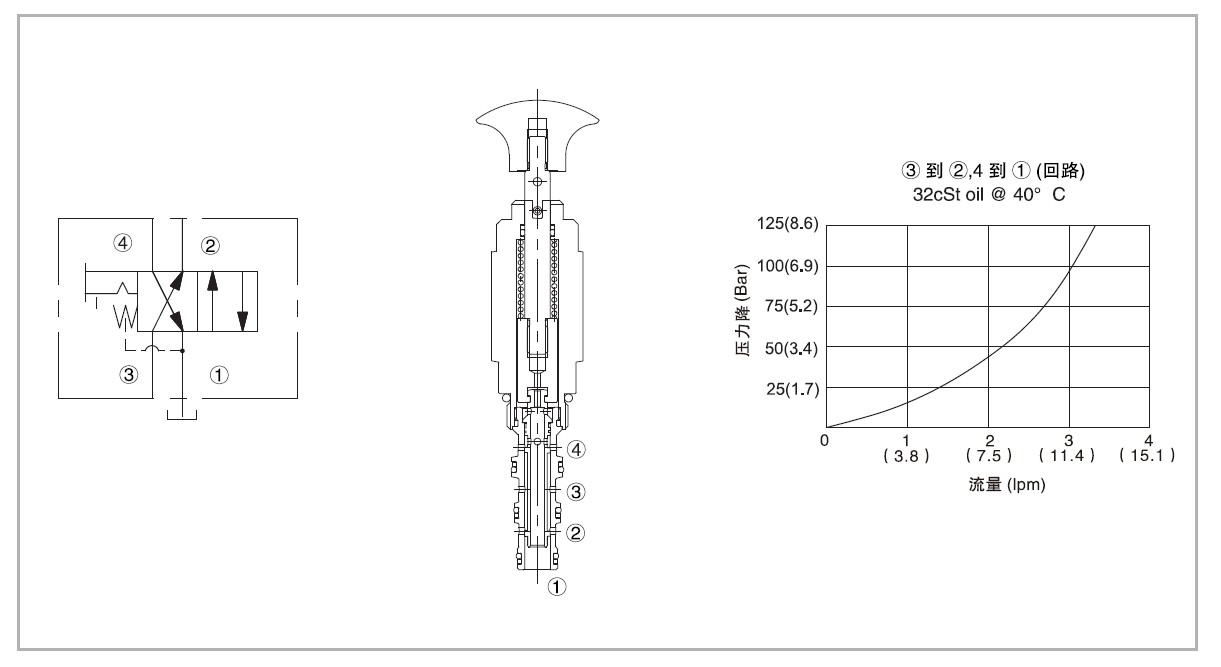 90℃后,彈簧復(fù)位,油液通道關(guān)閉。由于油箱油口①的額定壓力,因此禁止串聯(lián)使用。