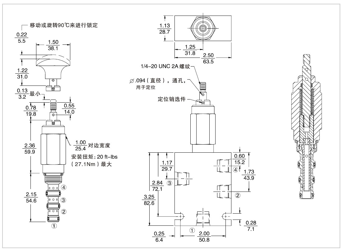 注:油口①的壓力將直接作用在閥芯和彈簧上。油口①只作為油箱接口??梢圆捎锚?dú)特的拉動(dòng)旋轉(zhuǎn)