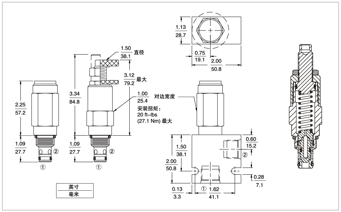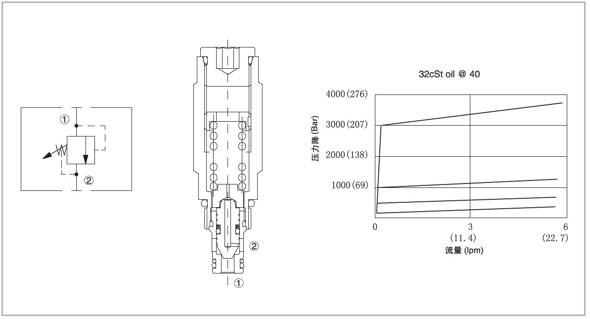 當(dāng)①口壓力達到設(shè)定壓力時,從①口到②口才打開,以保持系統(tǒng)壓力不超過設(shè)定值。
