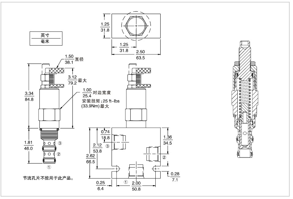 (取決于彈簧設(shè)定值),閥芯將開始壓力補(bǔ)償,壓降范圍約為4.8 Bar至13.8 bar。旁路②口可作為工作口。